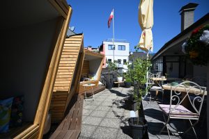 Mit viel Liebe gestaltet, erwarten Sie handgefertigte Strandkörbe, eine Hängeschaukel, gemütliche Lounge-Ecke und Tische zum Frühstücken im Freien. Ob ein ruhiger Start in den Tag mit frischem Kaffee, ein sonniger Nachmittag mit einem Eis aus der benachbarten Eisdiele oder ein Glas Wein an einem lauen Sommerabend – hier finden Sie Raum für Ruhe, Genuss und Erholung mitten im Stadtzentrum.