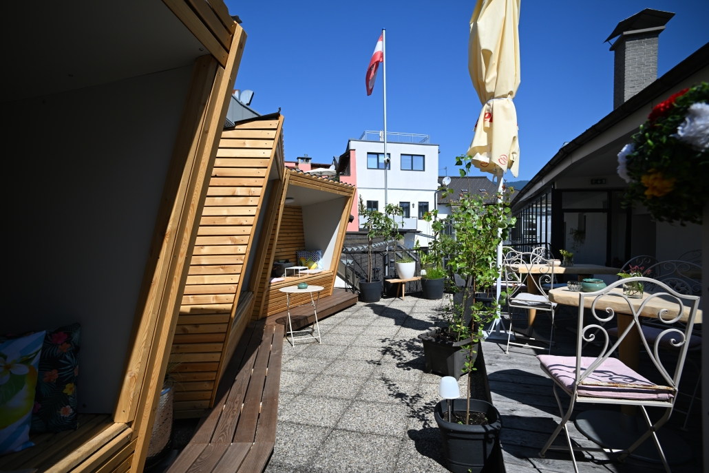 Unsere neu gestaltete Innenhofterrasse im 2. Stock ist ein echter Geheimtipp – ausschließlich für unsere Hotelgäste. Versteckt im Herzen der Stadt, umgeben von Grün, lädt diese kleine Oase zum Entspannen, Genießen und Verweilen ein.